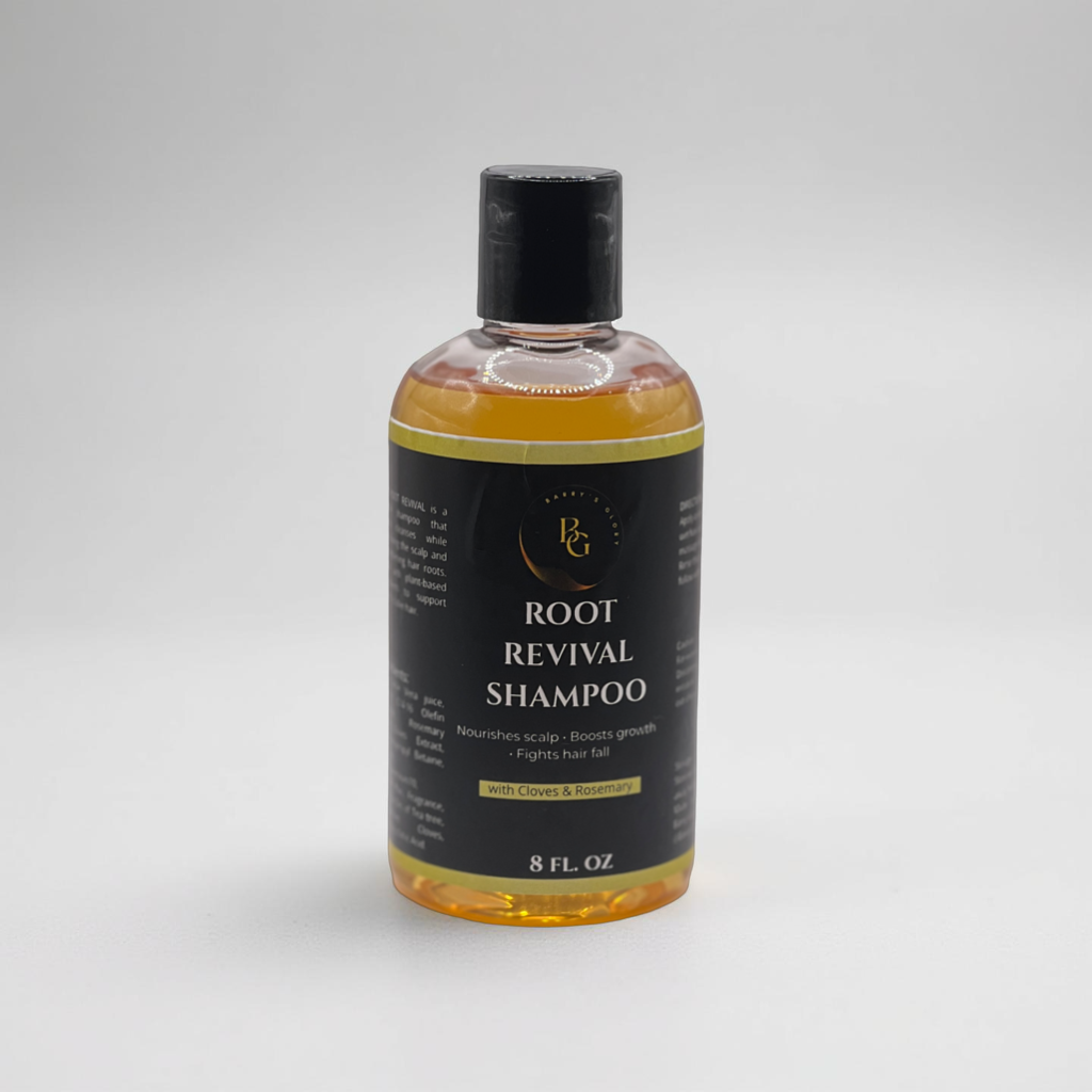 - Root Revival Shampoo (8oz) – Gently cleanses while nourishing the scalp, boosting growth, and reducing hair fall with cloves & rosemary.